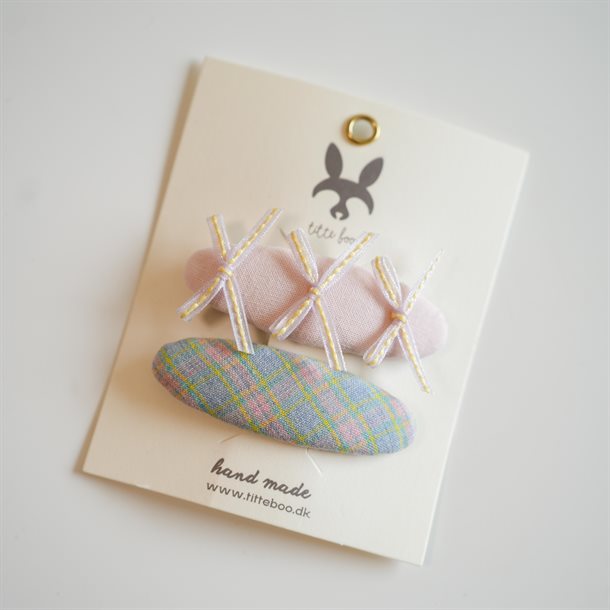 Denne sæson vælger vi plaid med søde sløjfer og skinnende risperler. Farveskemaet er mere i tråd med forårets pust. Vi fortsætter med at bruge nikkelfri metal-hårnåle af høj kvalitet, og bagsiden af hårnålene er ruskindsdug, der ikke er let at pille.